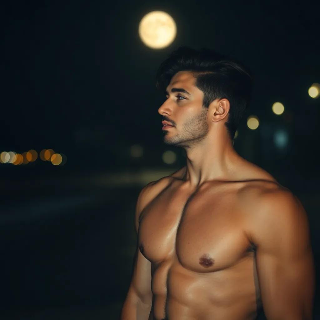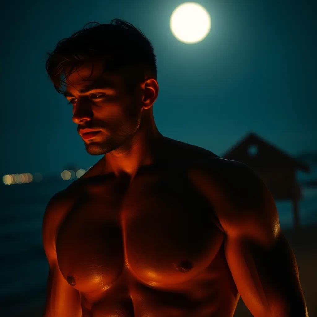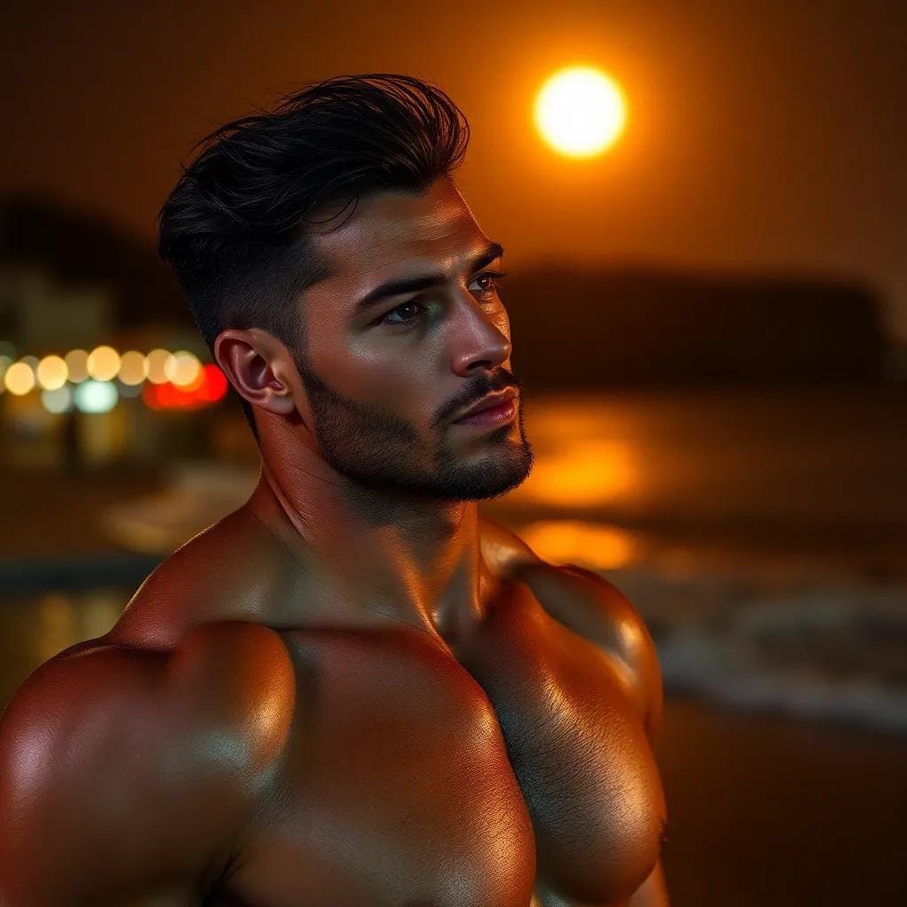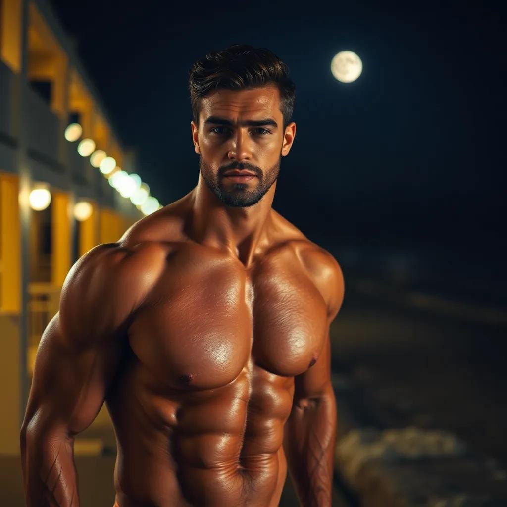 In the warm nights of a beachside town, where rugged masculinity reigned supreme, I found myself entranced by the sight of a sculptural body. His muscular physique glistened under the moonlight, as he danced to the rhythm of the waves, his strong jawline set in a determined pose.
