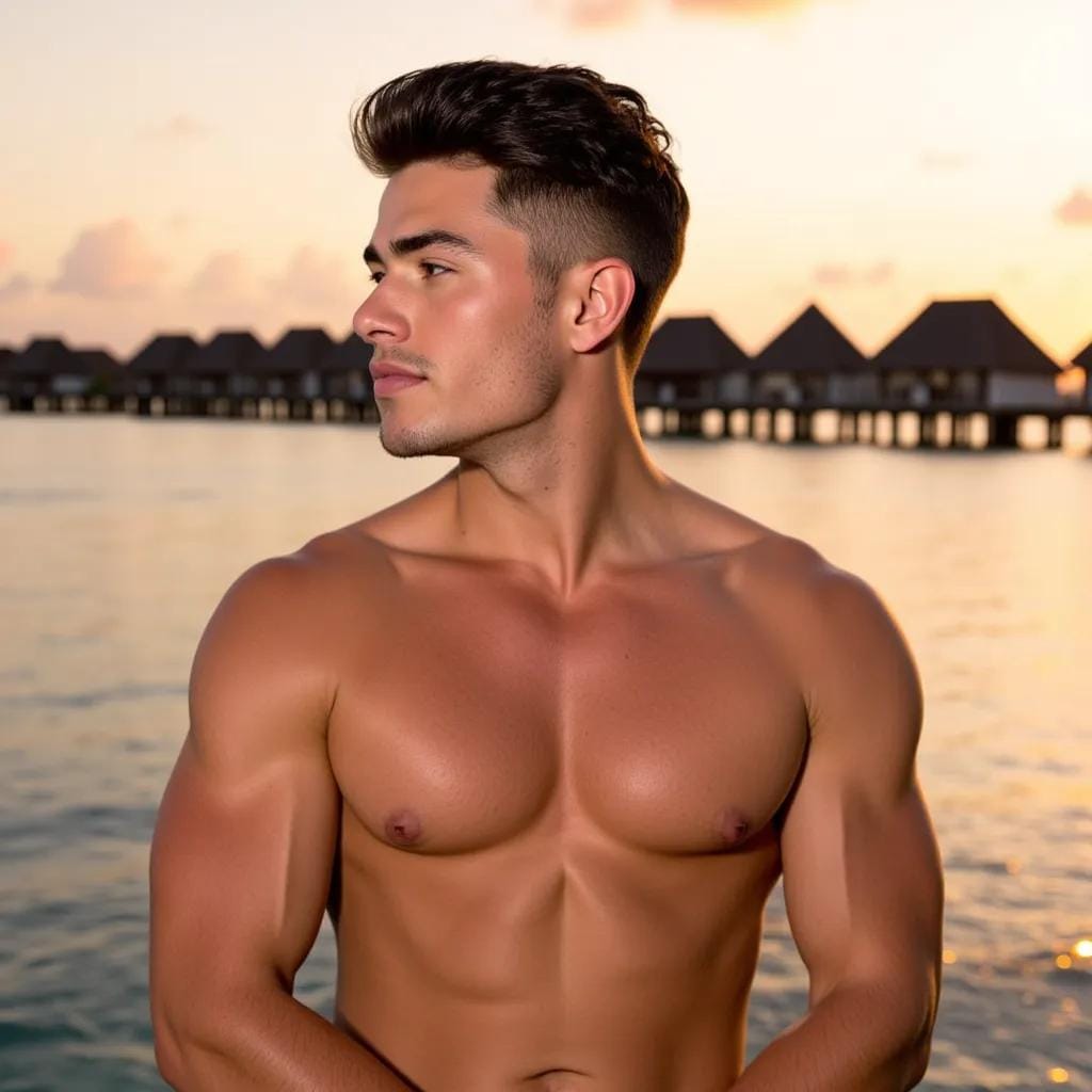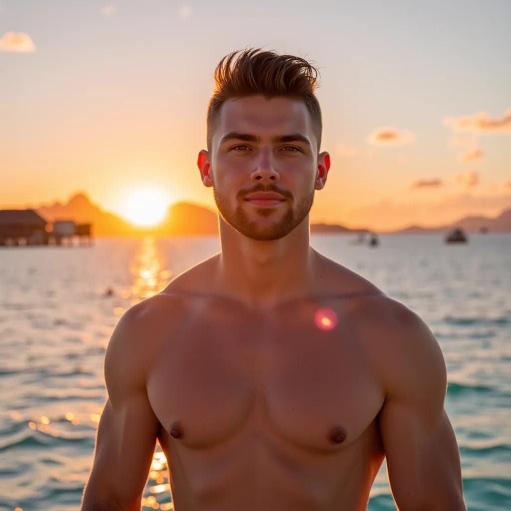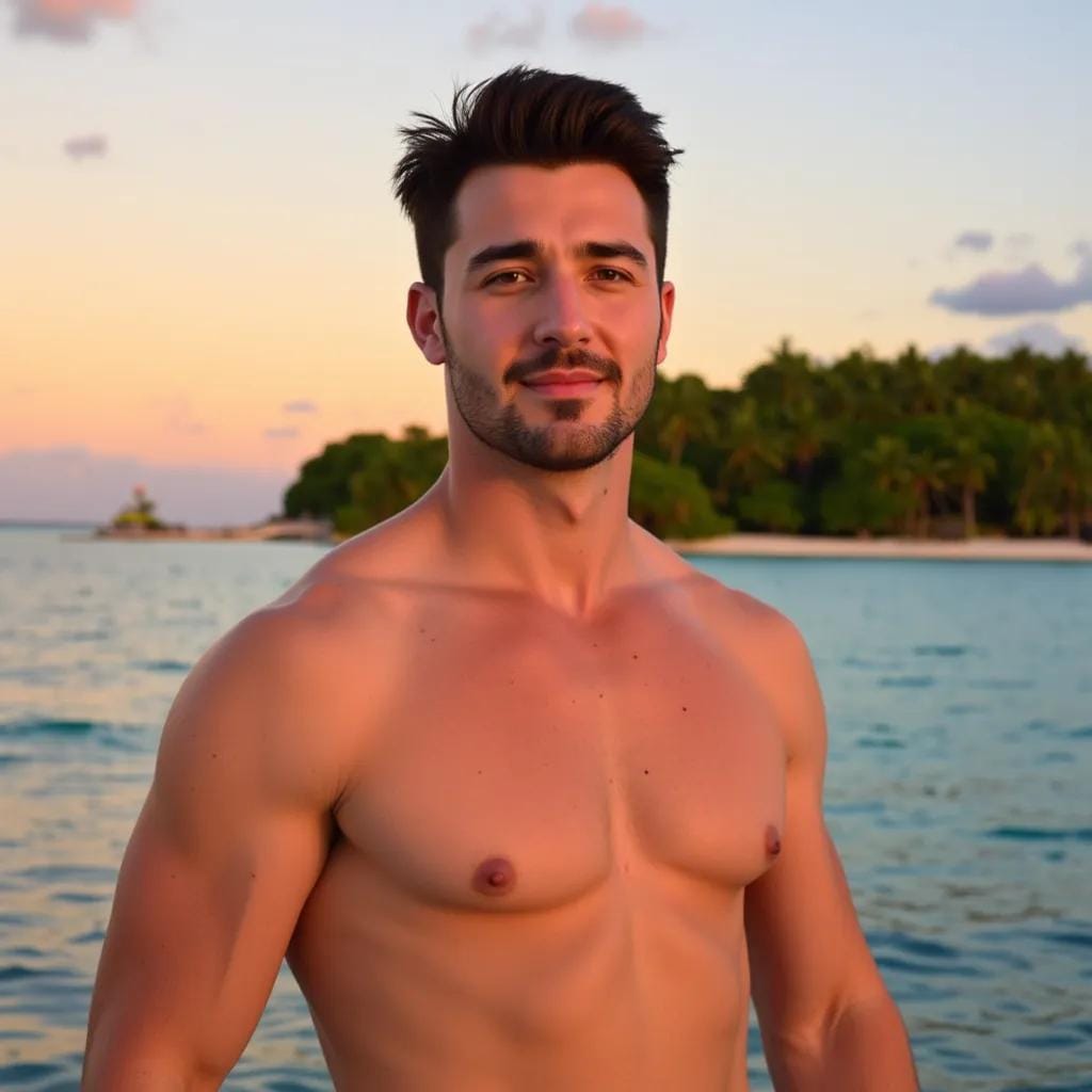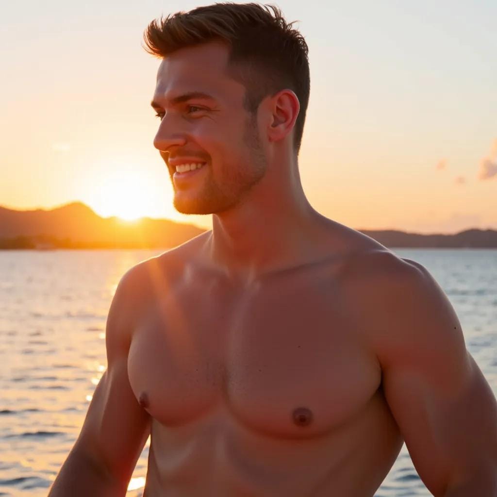 My eyes were drawn to the figure standing on the beach, his chiseled physique glistening in the fading light. He was a man of rugged masculinity, his broad shoulders and powerful chest a testament to his athletic build.