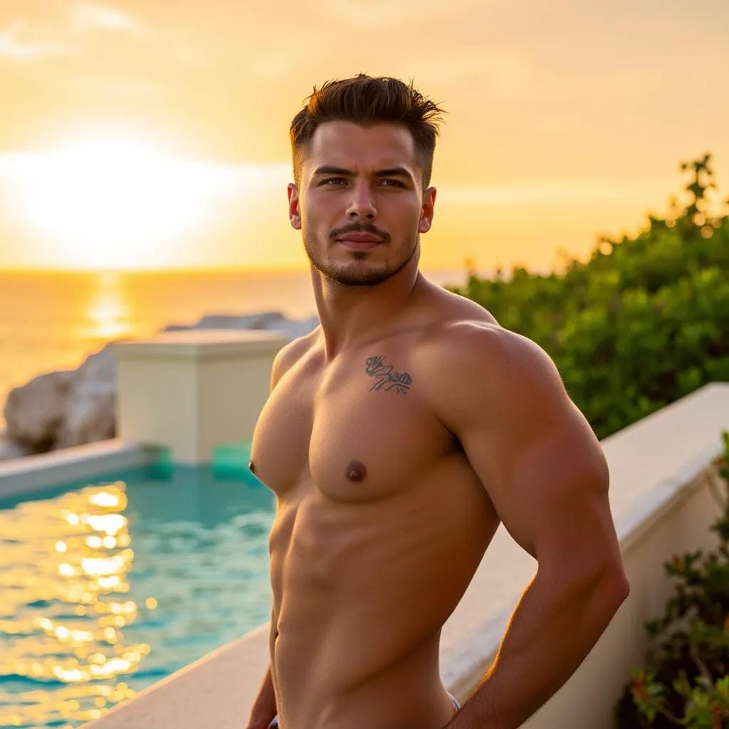 Kai's chiseled physique, honed from years of surfing and outdoor adventures, was on full display beneath his fitted, white linen shirt, and I couldn't help but be drawn to the rugged lines of his jaw, the sharp angles of his cheekbones, and the piercing blue of his eyes. As we reached the villa, Kai led me to the outdoor shower, where the warm water cascaded down his broad, muscular back, creating a mesmerizing display of liquid art.