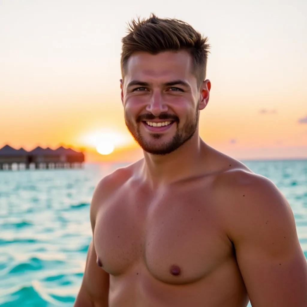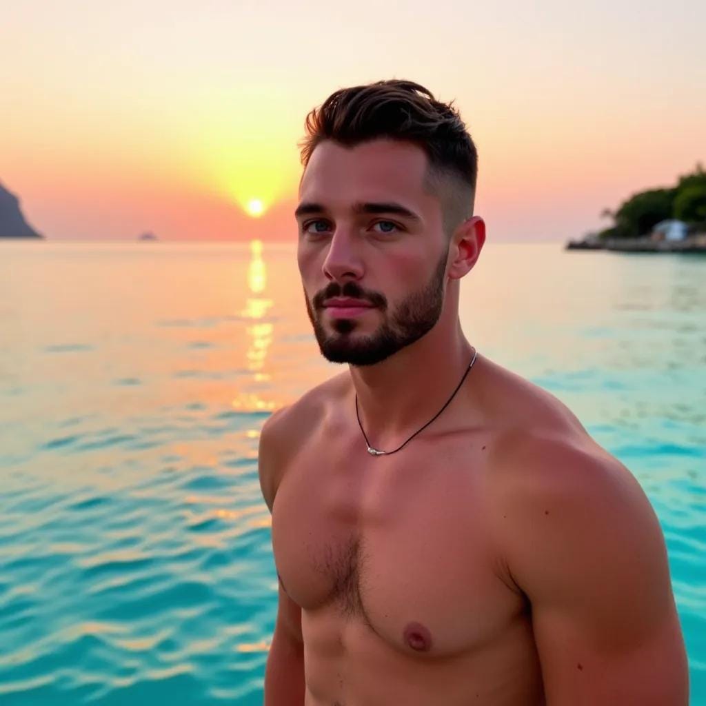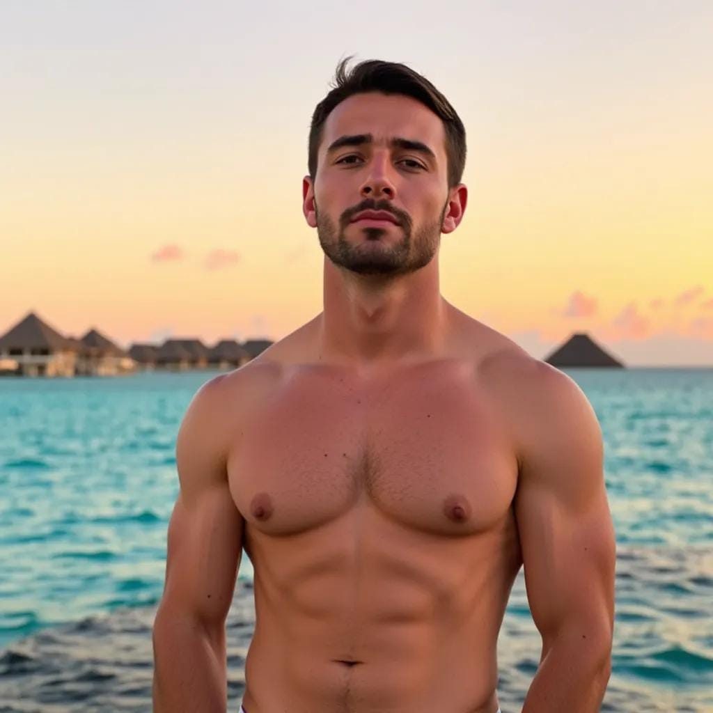 As the sun dipped below the turquoise horizon, casting a warm orange glow over the island of Bora Bora, I found myself entranced by the rugged beauty of my companion, Ryder. He stood at the edge of the lagoon, his broad shoulders silhouetted against the vibrant hues of the sky.