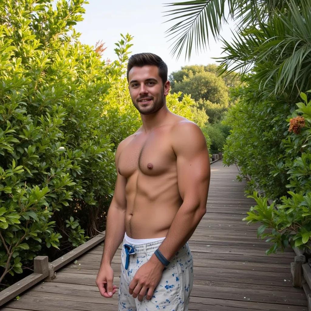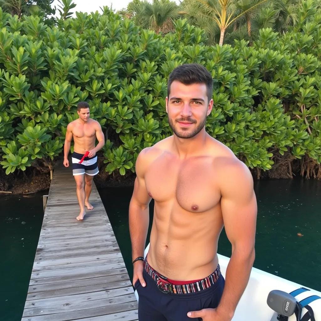 As the last wisps of sunset dissolved into the Indian Ocean, I stood poised on the weathered wooden dock, my eyes fixed on the rugged figure emerging from the dense foliage of the Maldivian jungle. His name was Kael, a skilled safari guide with a reputation for navigating the unforgiving terrain with unyielding confidence. "I trust the first lion he meets will do his duty," my friend had quipped, her voice laced with a mix of amusement and trepidation, as she handed me the camera and bid me farewell. Kael's broad shoulders and chiseled physique seemed carved from the very rock that surrounded us.