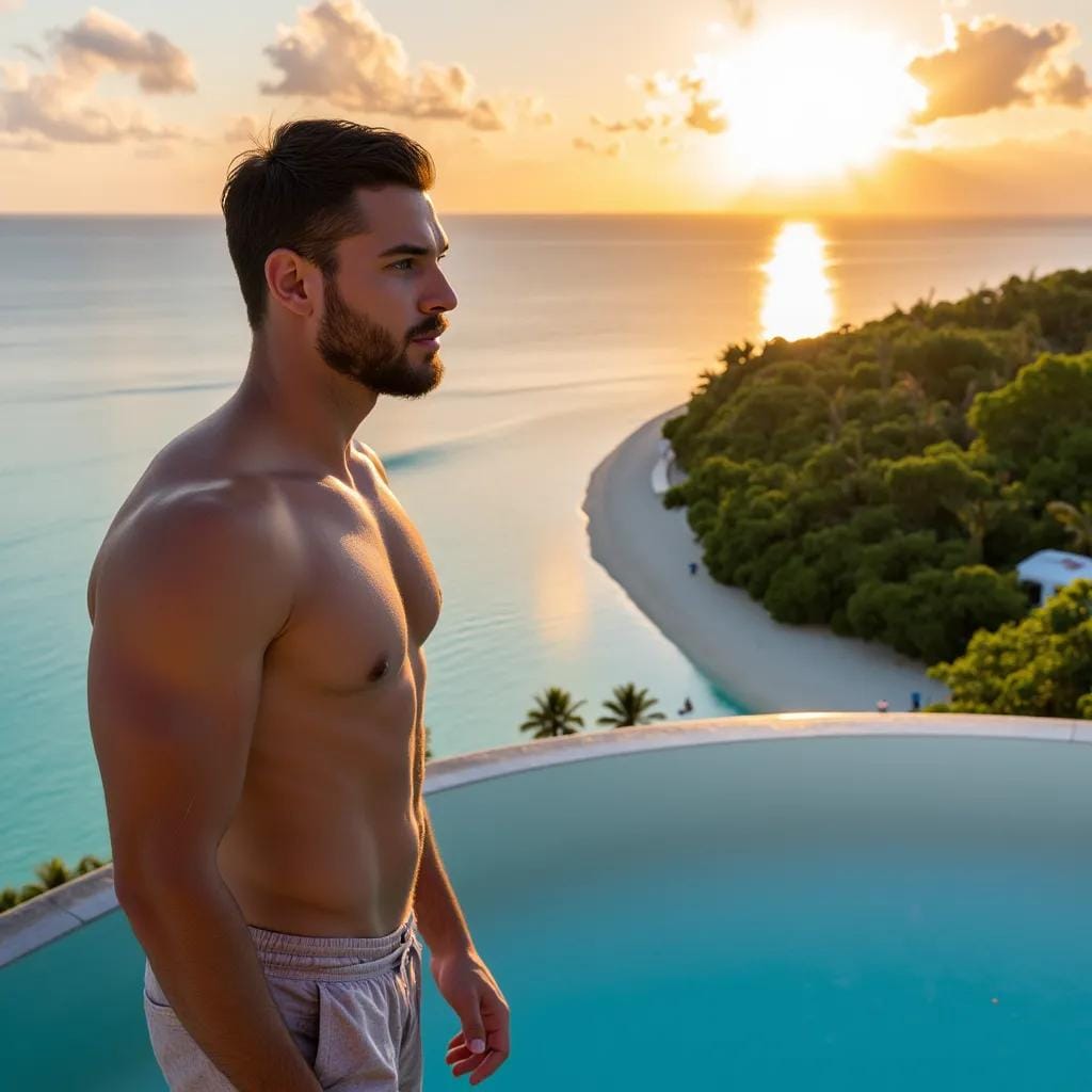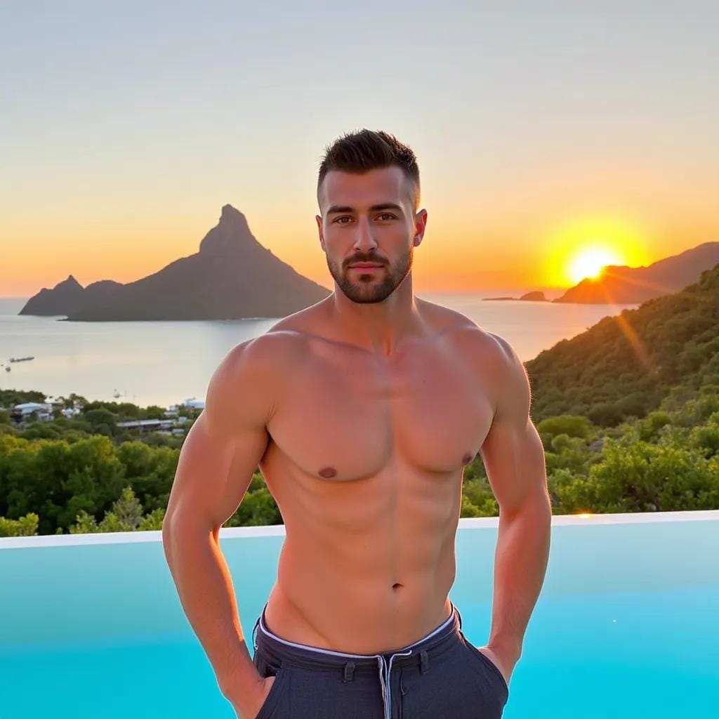 "The Island of Desire" As the sun dipped into the turquoise waters of Bora Bora, casting a warm orange glow over the island's lush greenery, Sam stood at the edge of the infinity pool, his eyes fixed on the breathtaking view before him. His companion, Norm, lounged on a plush chaise longue, a cold beer clutched in his hand, his rugged features relaxed in a state of tranquility. "Any cheap, tawdry thing that'll get me a beer," Norm drawled, his deep voice husky with amusement. Sam's gaze never wavered from Norm's chiseled profile, his eyes drinking in the sight of his companion's strong jawline, his broad shoulders, and his powerful physique.
