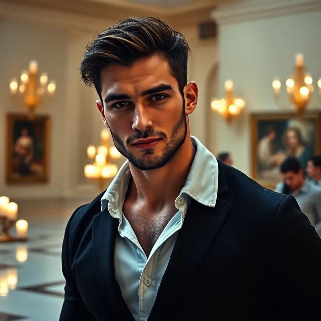 In the rarefied atmosphere of the city's premier art gallery, where the soft glow of candelabras danced across the polished marble floor, Emma found herself drawn to the enigmatic figure of Julian. His eyes, like two sapphires, sparkled with an inner light as he stood before a vibrant abstract, his fingers tracing the curves of the brushstrokes with an intimacy that seemed almost...personal. As she watched, transfixed, he turned to her, a hint of a smile playing on his lips.