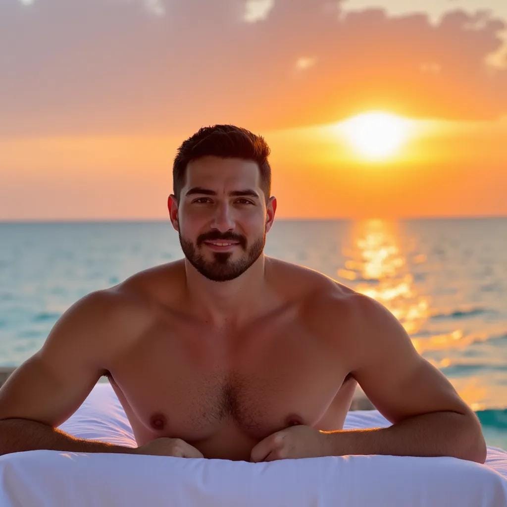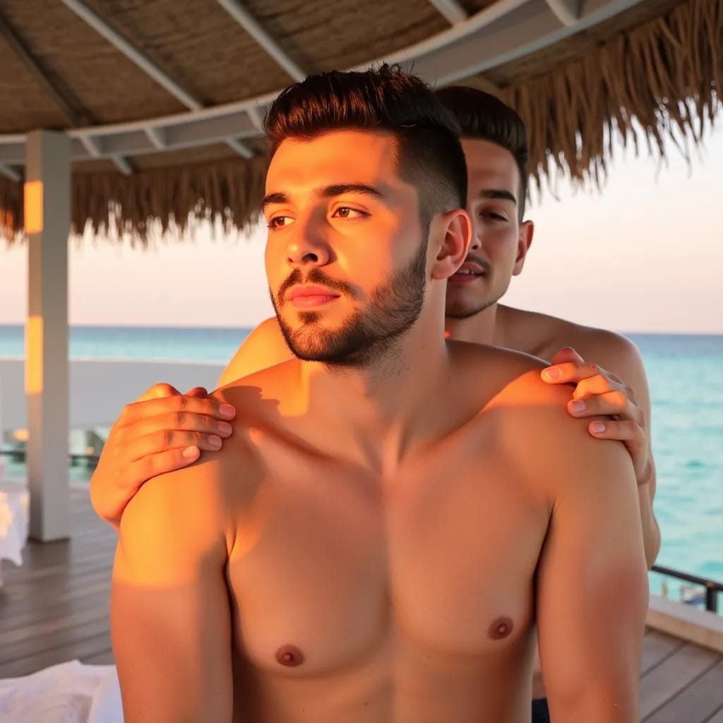 The sun had just set over the crystal-clear waters of the Maldives, casting a warm orange glow over the luxurious overwater bungalow where Alessandro and Julian were indulging in a sensual massage. The gentle lapping of the waves against the hull of the bungalow created a soothing melody, perfectly complementing the skilled hands of their masseuse, a beautiful young woman named Leilani. As Leilani's fingers expertly kneaded the tension from Alessandro's broad shoulders, Julian couldn't help but feel a surge of desire.