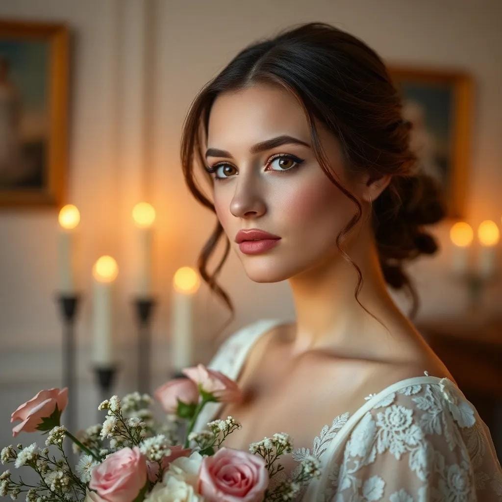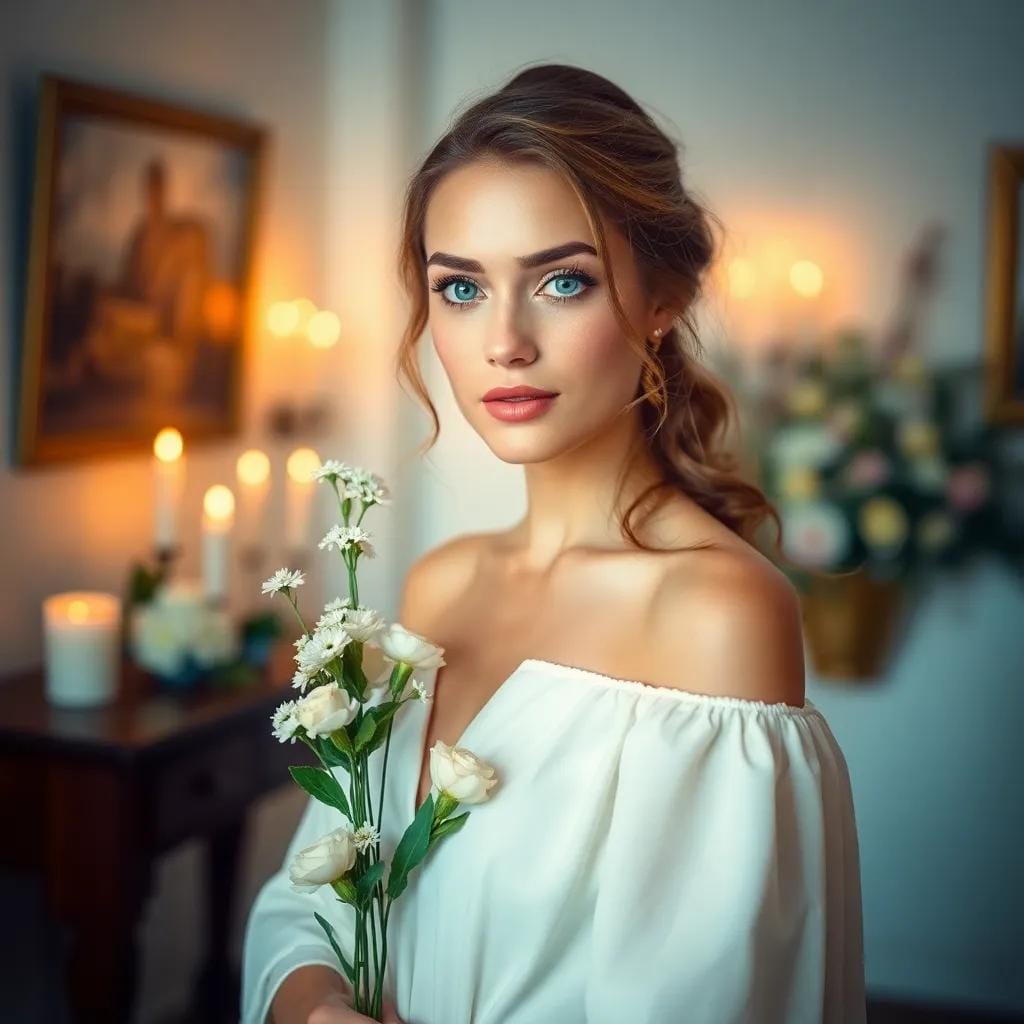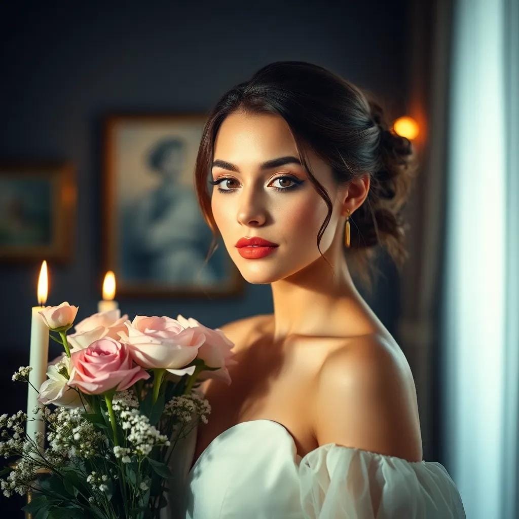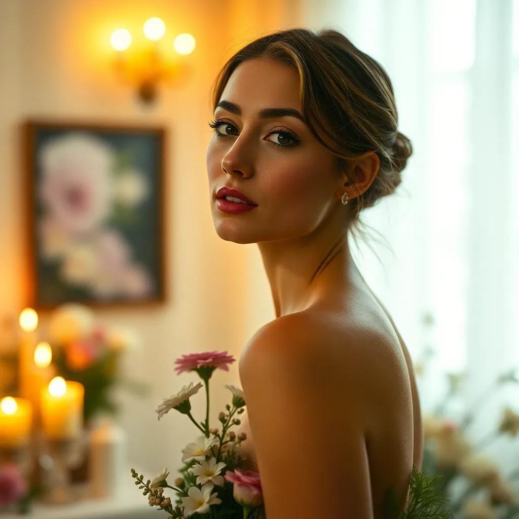 In the serene gallery, the fragrance of freshly cut flowers filled the air, creating a peaceful ambiance. The soft glow of candles illuminated the room, casting a warm, golden light on the elegant silk sheets that draped the plush, velvet couch. Lena, a stunning beauty with her porcelain skin and raven-black hair, lay reclining on the couch, her body a work of art.