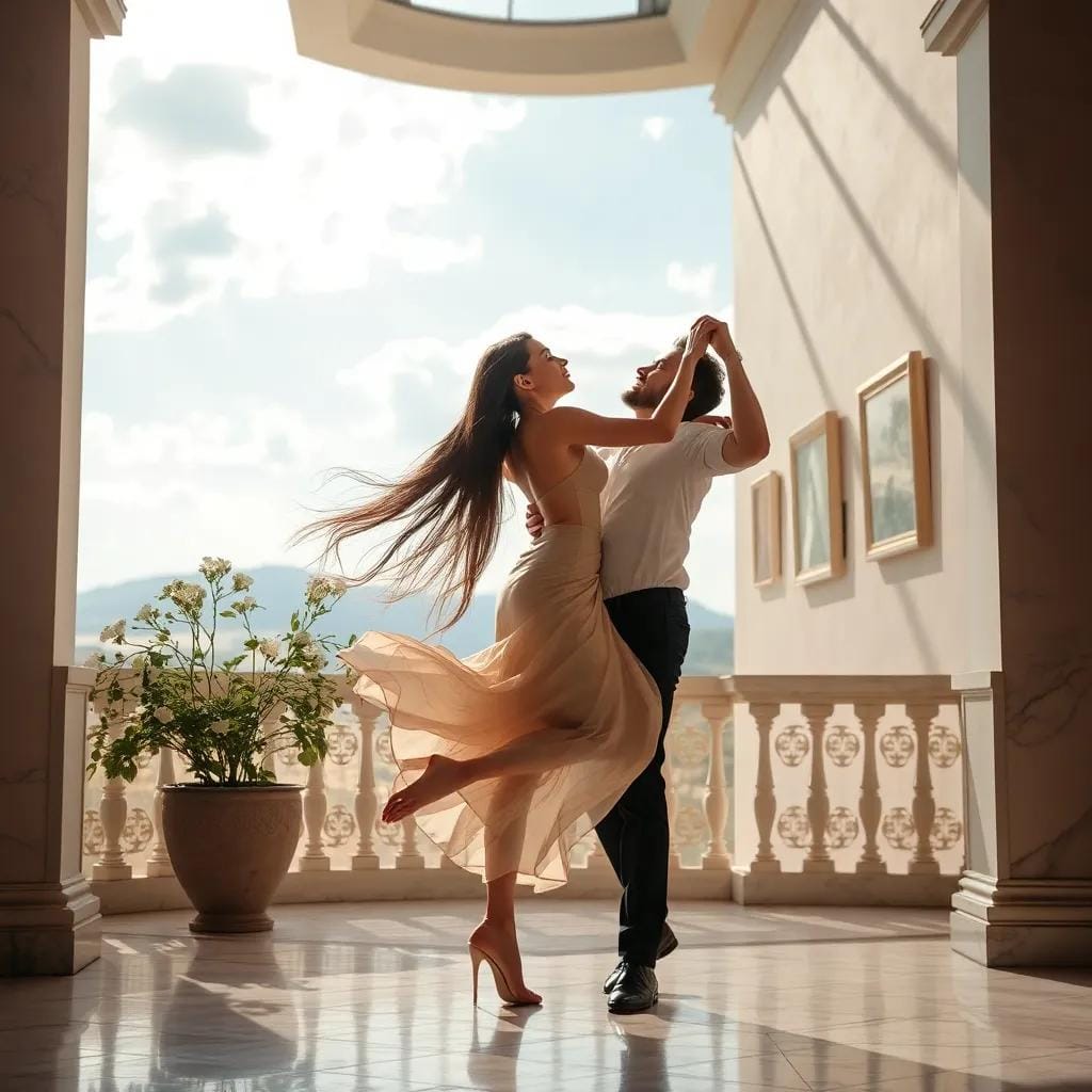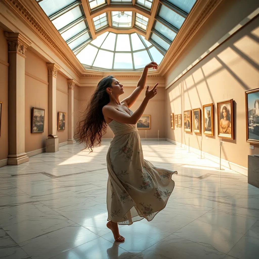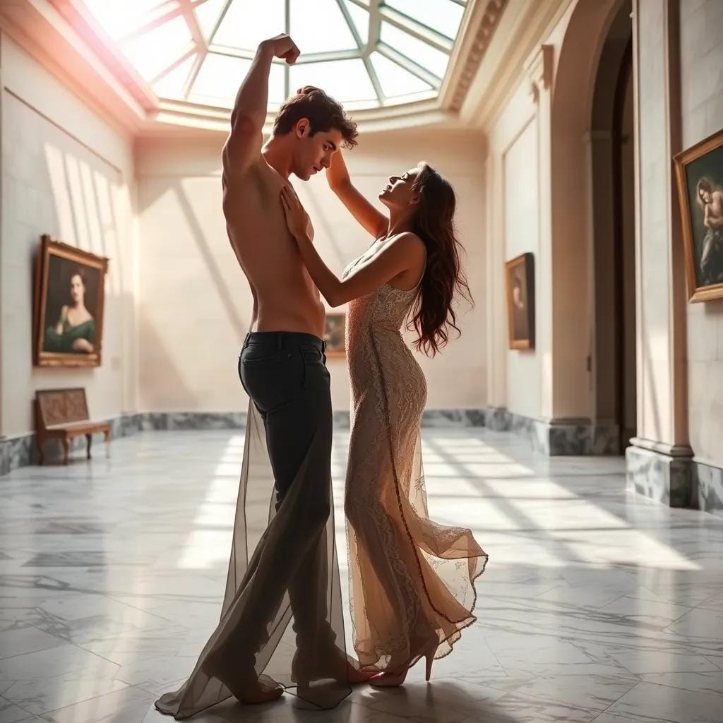 In the tranquil atmosphere of the city's oldest art gallery, where sunlight streamed through the skylight and danced across the marble floors, Emma and Max found themselves entwined in a world of beauty and discovery. As they wandered through the galleries, their fingers brushed against each other, sending a shiver down their spines. Their footsteps echoed off the walls as they paused in front of a particularly striking piece – a masterpiece of Impressionist art, its colors bleeding into one another like the gentle hues of a sunset.