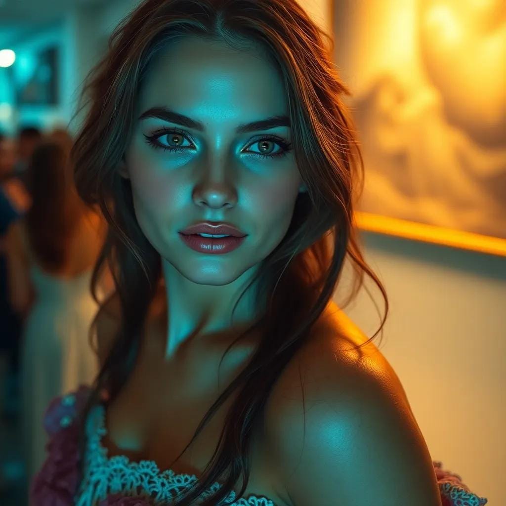 The soft glow of the art gallery's evening light danced across the faces of the patrons, casting a warm ambiance over the crowded space. Amidst the murmurs of admiration and gentle laughter, Emma's eyes locked onto Jack's, their gazes meeting in a fleeting moment of connection.
