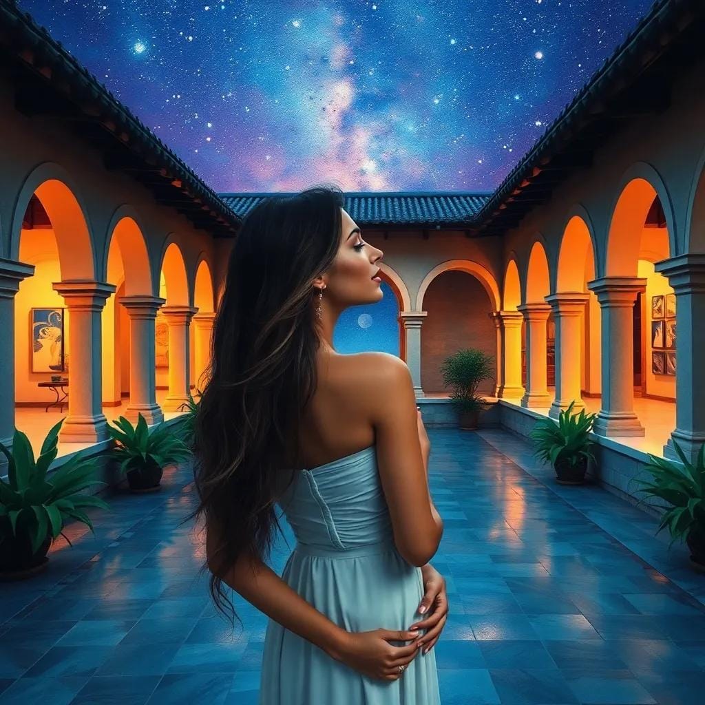 The delicate brushstrokes and soft colors seemed to whisper secrets of the night, of the mysteries that lay just beyond the reach of the stars. The director noticed her fascination and led her to a small, intimate café, tucked away in a corner of the gallery. Over steaming cups of coffee, they discussed the art of seeing, of capturing the essence of a moment, and the beauty that lay hidden in the world. Emilia felt a sense of connection, as if the universe had conspired to bring her to this place, at this moment, with this kindred spirit. As they sipped their coffee, the world outside seemed to fade away, leaving only the two of them, lost in the beauty of art and the magic of the night. As the sun began to set, casting a warm, golden light over the courtyard, Emilia knew that she had found a kindred spirit, a fellow traveler in the world of art and beauty. And as they strolled through the gallery, hand in hand, the world seemed to stretch out before them, a canvas waiting to be filled with the vibrant hues of their love.