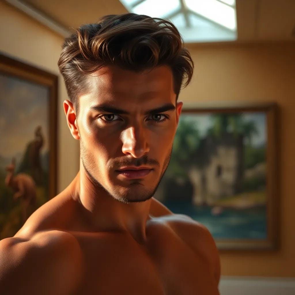 As she stood there, transfixed, Alex appeared beside her, his presence as subtle as a summer breeze. Together, they stood before the painting, their shoulders nearly touching, as if drawn by an unseen force. Emma felt the gentle warmth of Alex's body, a sensation that sent a shiver down her spine. She didn't dare glance at him, fearing she might lose her train of thought, or worse, her composure. The artist's brushstrokes seemed to whisper secrets to her, of light and shadow, of the fleeting nature of beauty. Emma's mind wandered to the concept of impermanence, a theme that resonated deeply with her.