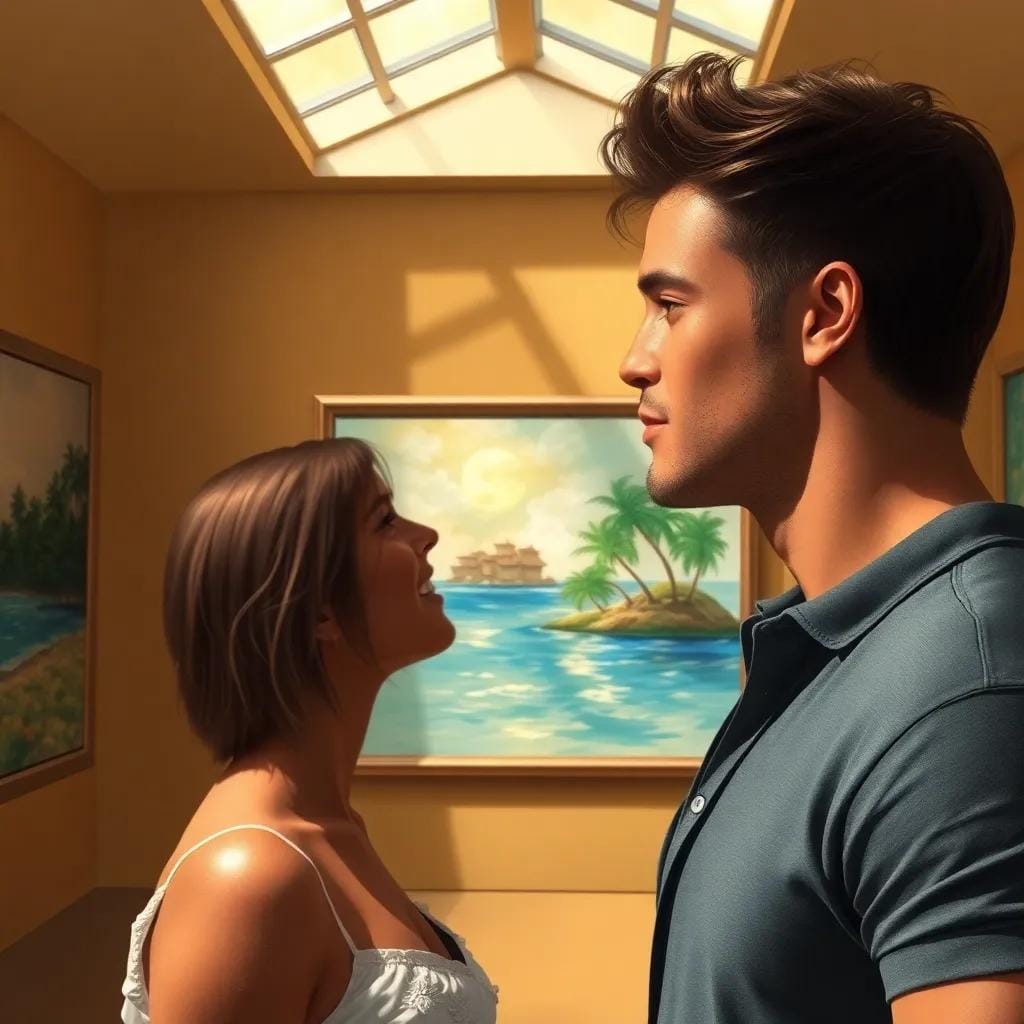 She felt an inexplicable connection to the painting, as if it spoke directly to her soul. Alex's voice broke the spell, his words a gentle breeze rustling the leaves of her thoughts. "I love how the light plays across the canvas," he said, his eyes never leaving the painting. "It's as if the colors are alive, dancing just for us." Emma turned to him, her gaze meeting his, and for a moment, they simply looked at each other. The air between them vibrated with an unspoken understanding, a sense of shared wonder that went beyond words.