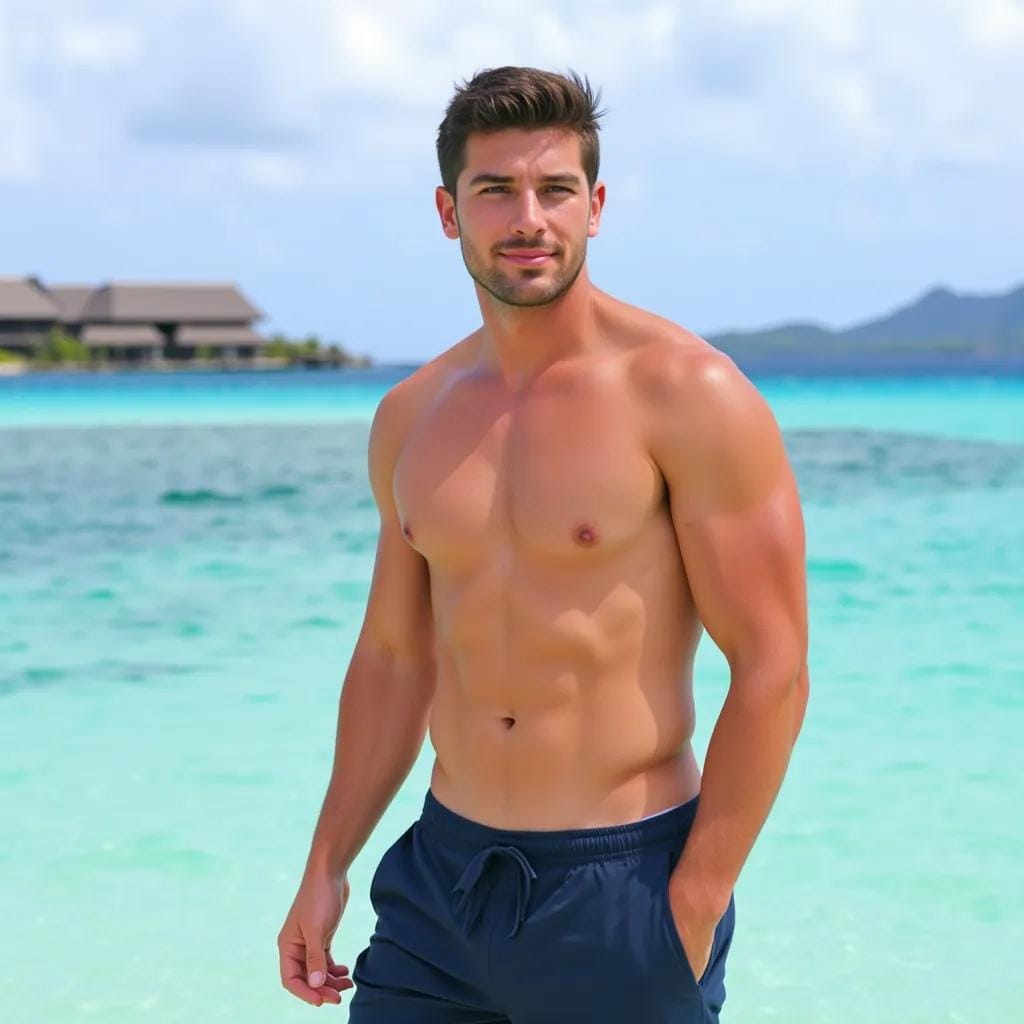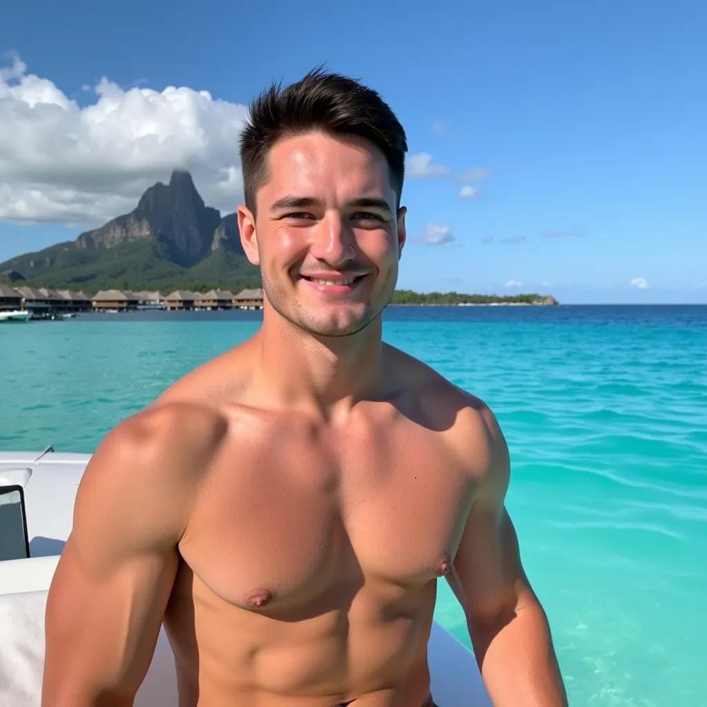 But for me, it's the catalyst that brings me to the sun-kissed shores of Bora Bora, where the turquoise lagoon meets the warm, golden sand. It's here that I meet him, a chiseled Adonis with piercing blue eyes and a rugged jawline that could stop a clock.