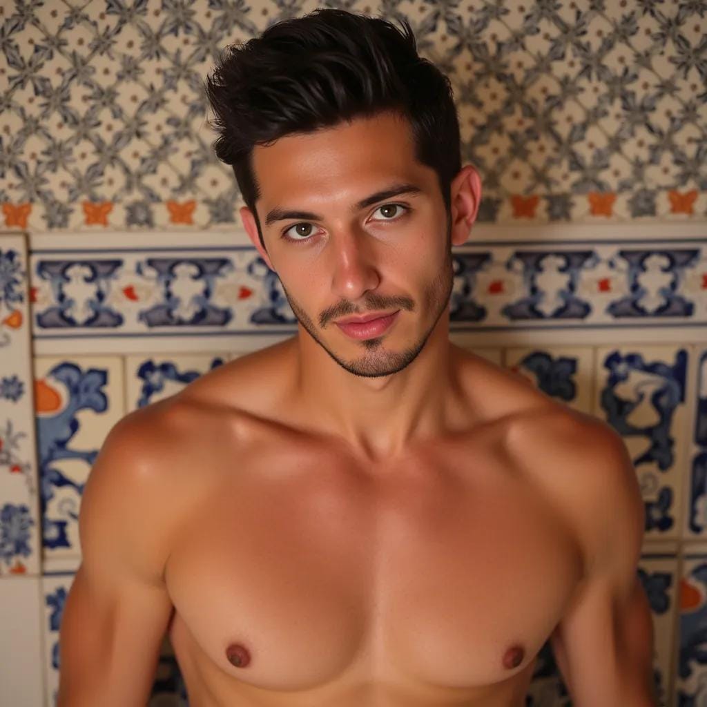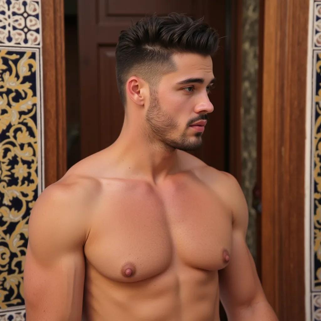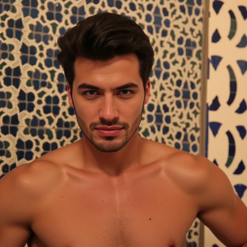 In the sultry twilight of a Moroccan riad, where intricately tiled walls and sumptuous fabrics whispered secrets of a bygone era, I found myself entwined in a dance of desire with the enigmatic and breathtakingly handsome, Khalid. As I posed for his camera, the soft glow of candles casting shadows on his chiseled features, I couldn't help but be drawn to the intensity of his gaze. His eyes, like the darkest, most polished obsidian, seemed to bore into my very soul, leaving me breathless and wanting. With each click of the shutter, the air grew thick with tension, the space between us shrinking until it seemed we were mere inches apart.