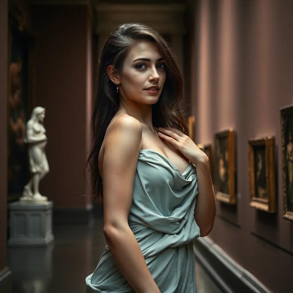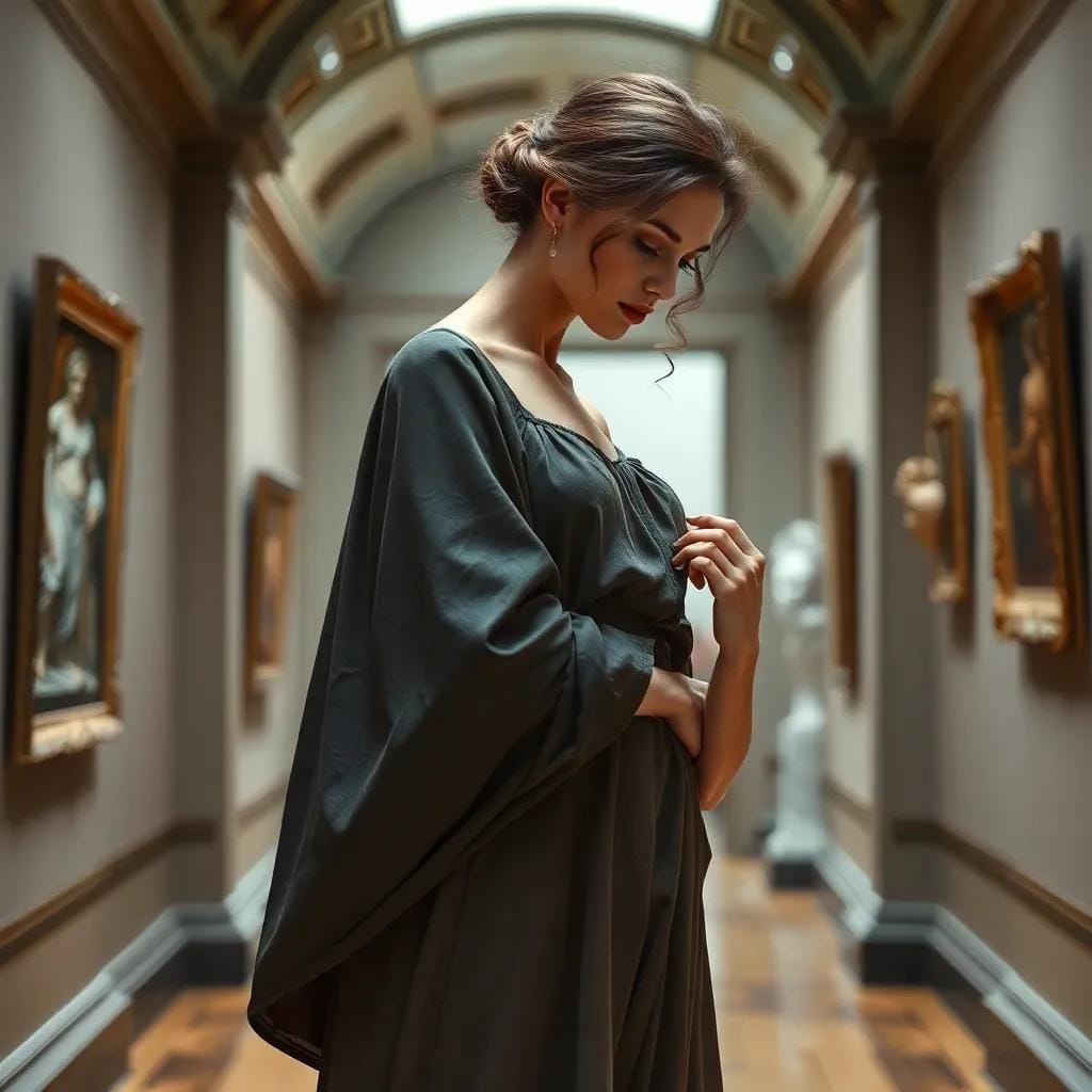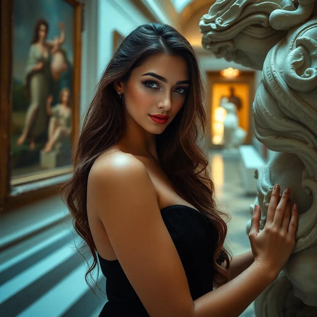 In the hushed corridors of the city's premier art gallery, amidst masterpieces that whispered tales of love and loss, Lena wandered, her fingers trailing the contours of a Renaissance-era sculpture. Her eyes, like two dark pools, reflected the beauty that surrounded her, as if the art itself had seeped into her very soul.
