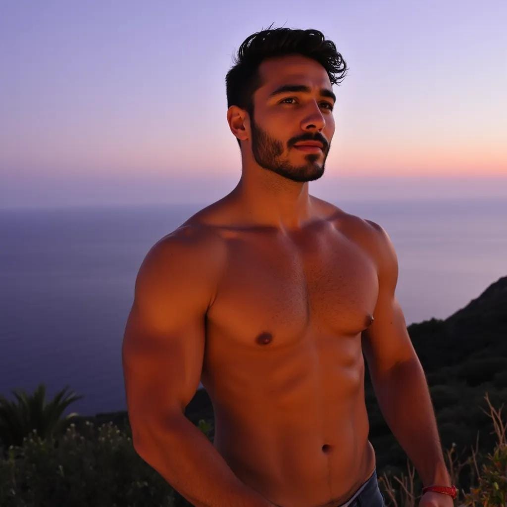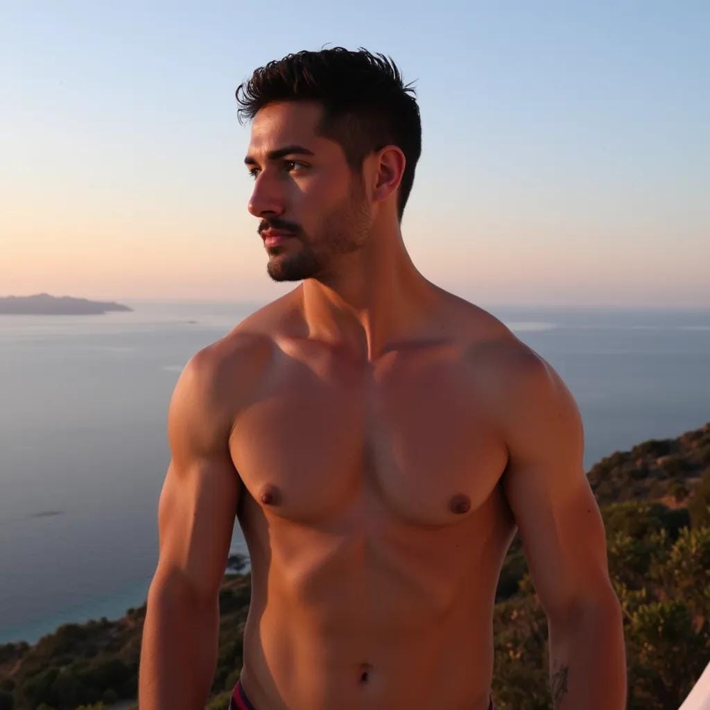 In the sultry twilight of a Sicilian villa, perched upon a hill overlooking the Mediterranean, Alessandro stood poised, his chiseled physique glistening with dew as he gazed out upon the sea. His rugged jawline, sharp as a granite cliff, was set in a determined expression, his eyes fixed upon the figure emerging from the shadows.
