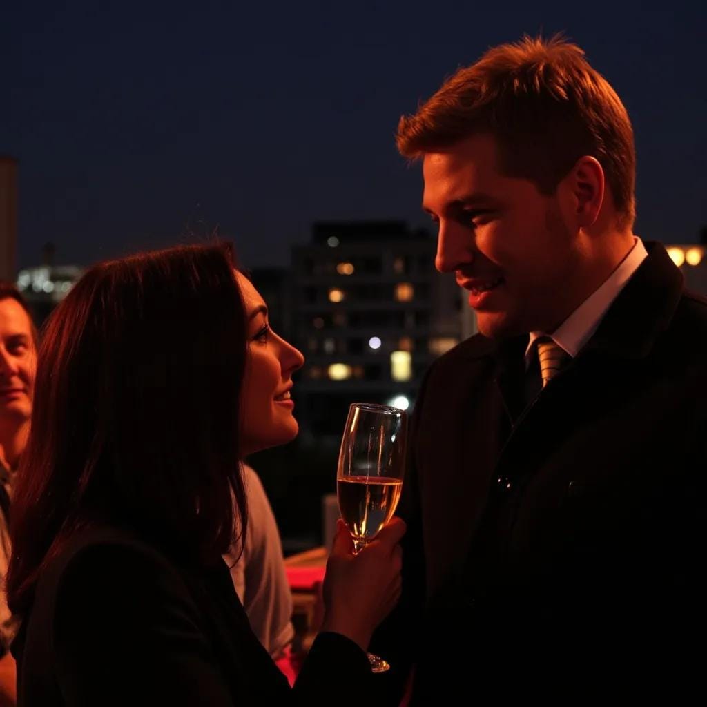 The evening's velvet darkness had descended like a shroud upon the city, casting a seductive spell over the gathering of intellectuals. Amidst the throng of strangers, I found myself ensnared by the piercing gaze of a stranger.